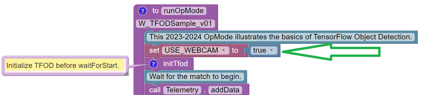 This loop repeatedly calls a Blocks Function called ``telemetryTfod``. That Function is the heart of the OpMode, seeking and evaluating recognized TFOD objects, and displaying DS Telemetry about those objects. It will be discussed below, in the next section.
