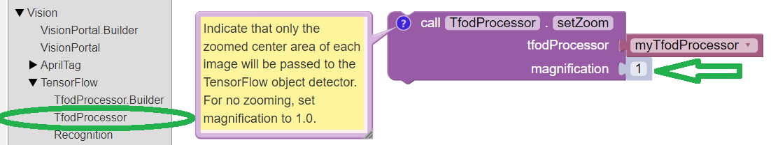 Pull out the ``setZoom`` Block, found in the toolbox or palette called “Vision”, under “TensorFlow” and “TfodProcessor” (see green oval above). Change the magnification value as desired (green arrow).
