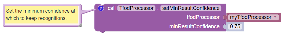 Pull out the ``setMinResultConfidence`` Block, found in the toolbox or palette called “Vision”, under “TensorFlow” and “TfodProcessor”. Adjust this parameter to a higher value if you would like the processor to be more selective in identifying an object.
