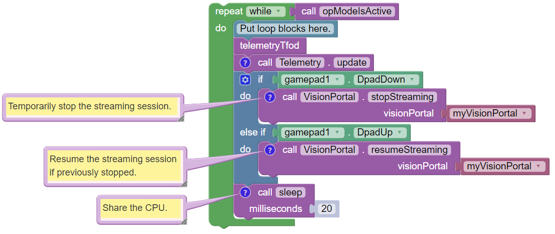 These two commands appear here in this Sample OpMode, to spread awareness of one tool for managing CPU and bandwidth resources. The FTC VisionPortal offers over 10 such controls, described here.