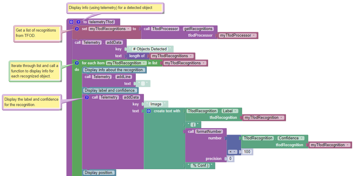 The green “FOR Loop” iterates through that List, handling each item, one at a time. Here the “handling” is simply displaying certain TFOD fields to DS Telemetry.