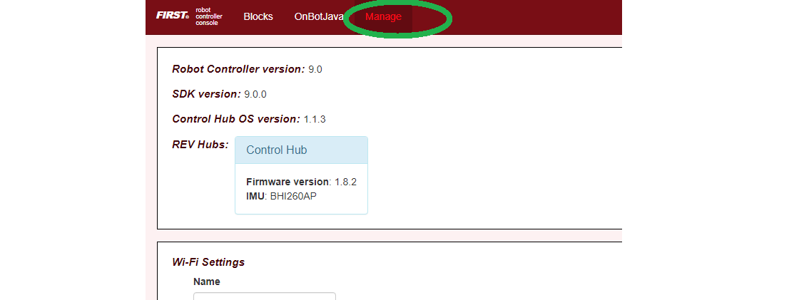 After downloading the file to your laptop, you need to upload it to the Robot Controller. Connect your laptop to your Robot Controller’s wireless network and navigate to the FTC “Manage” page: