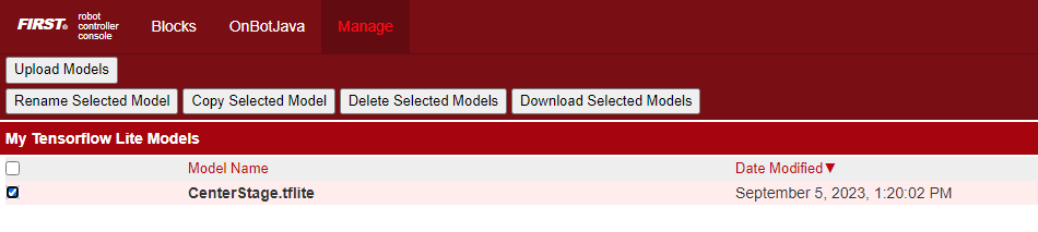 Now the file will upload to the Robot Controller. The file will appear in the list of TensorFlow models available for use in OpModes.