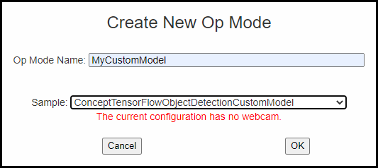 If no webcam is configured for your REV Control Hub, the dialog box will display a warning message (shown here). You can ignore this warning message if you will use the built-in camera of an Android RC phone. Click “OK” to create your new OpMode.