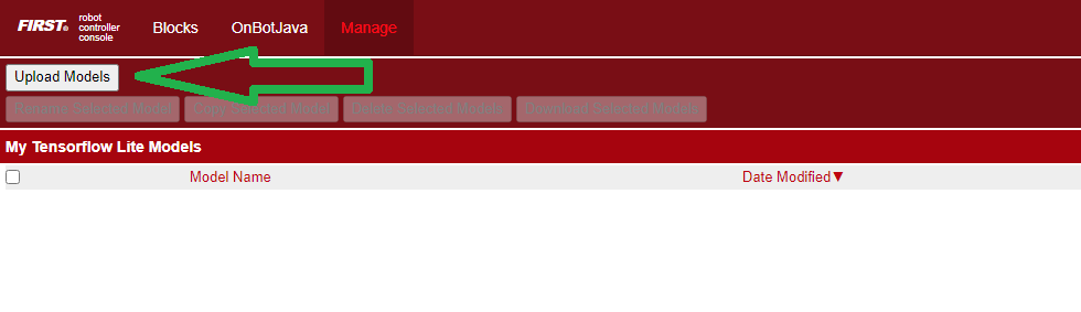 Next, OnBot Java users will upload the TFOD model to the Robot Controller. Connect your laptop to your Robot Controller’s wireless network, open the Chrome browser, and navigate to the FTC “Manage” page: