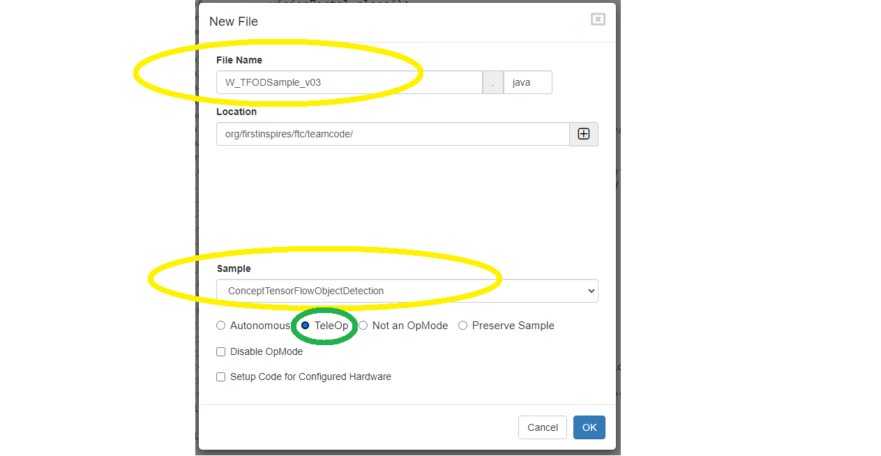 Specify a name for your new OpMode. Select “ConceptTensorFlowObjectDetection” as the Sample OpMode to be the template for your new OpMode.