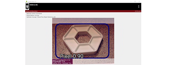 Telemetry is created for the Driver Station, with the object’s name (Label), recognition confidence level (percentage), and the Bounding Box’s location and size (in pixels).
