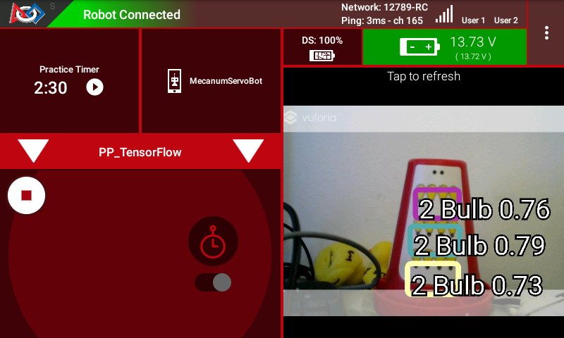 TensorFlow Object Detection (TFOD) has been integrated into the control system software to identify these Signal images during a match. The SDK (SDK version 8.0) contains TFOD Sample Op Modes and Detection Models that can recognize and differentiate between the Signal images: Bolt (green lightning bolt), Bulb (4 yellow light bulbs), and Panel (purple solar panels).